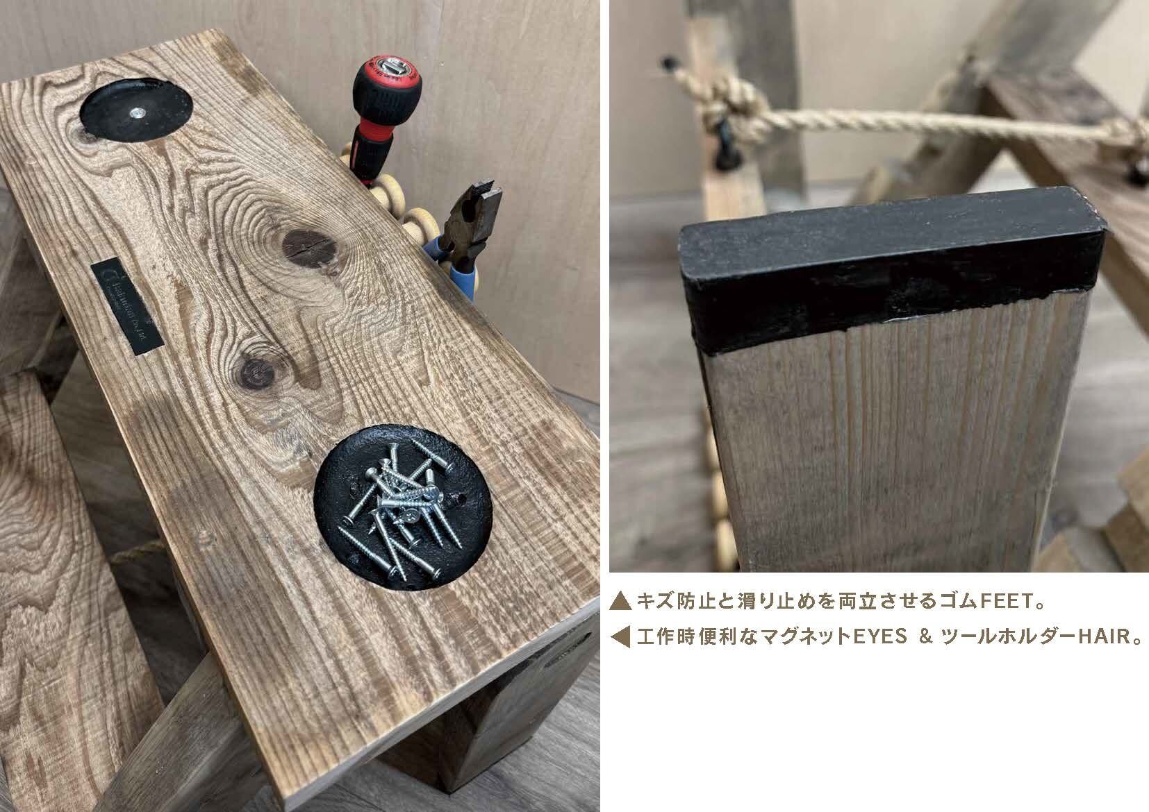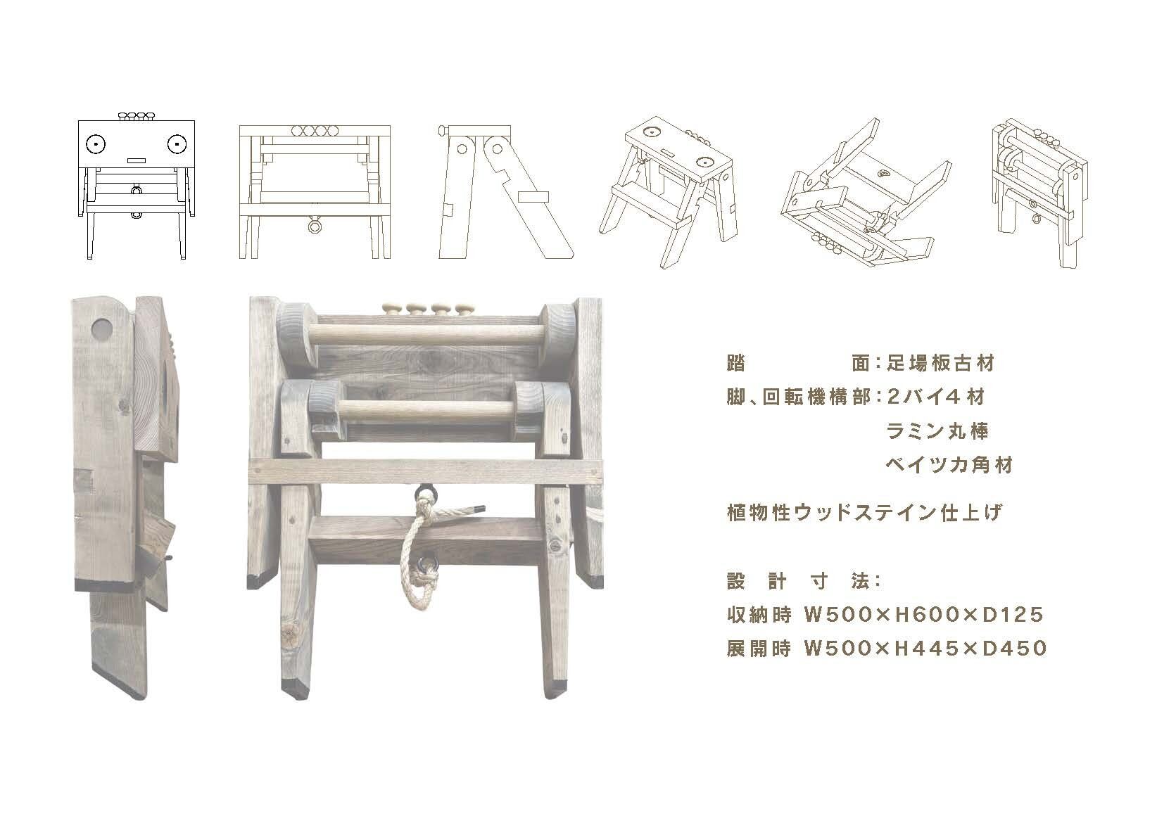 脚、回転機構部:2バイ4材ラミン丸棒 ベイツカ角材植物性ウッドステイン仕上げ